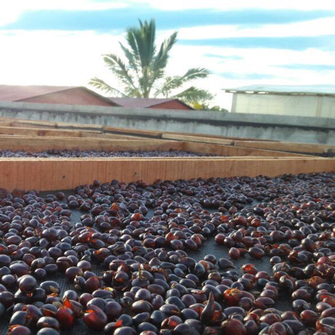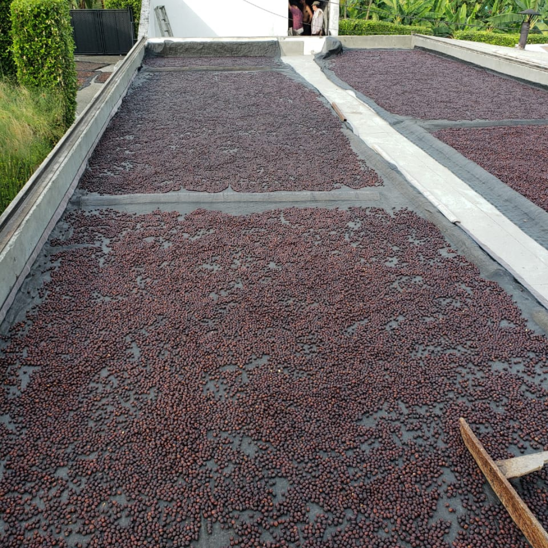 The coffees are put on raised beds or concrete patios where the quality team carefully monitors the process to ensure even drying and correct moisture content of the bean. The target moisture content of 11% is achieved through meticulous attention during the drying process.