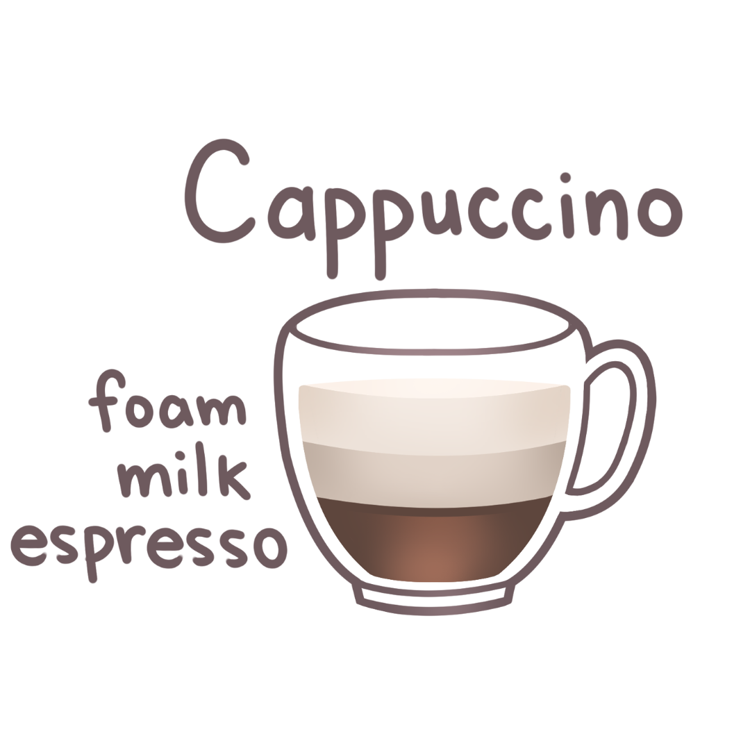 Served in a 8/10 oz cup. Cappuccinos work in thirds, 1/3 coffee, 1/3 steamed milk and 1/3 foam. There should be more foam than a flat white or latte. Traditionally, cappuccinos have a dusting of