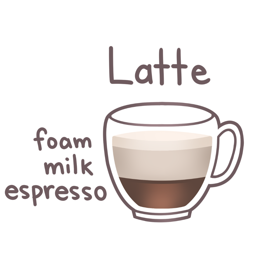 Served in a 8/10 oz cup. Lattes have a small layer of foam on top, allowing you to do latte art with the poured milk.